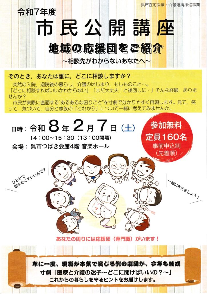 令和8年2月7日(土) 「令和7年度市民公開講座 地域の応援団をご紹介 ~相談先がわからないあなたへ~」 が開催されます。今年のテーマは「そのとき,あなたは誰に,どこに相談しますか?」です。市民向けの講座ですが,専門職も参加可能です。当協議会役員も寸劇に出演します。ぜひこの機会にご参加ください(参加無料) なお,事前申込みが必要です。詳細はチラシをご確認ください。