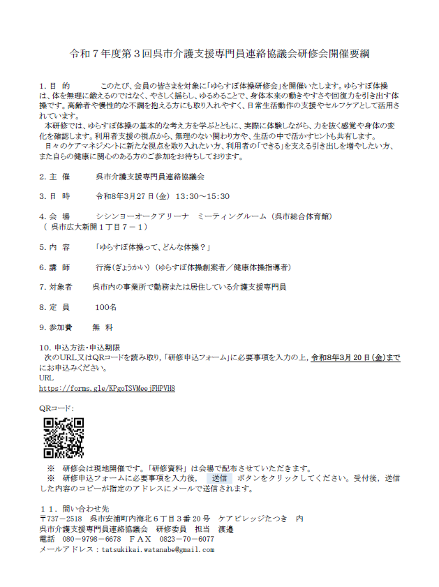このたび、会員の皆さまを対象に「ゆらすぽ体操研修会」を開催いたします。ゆらすぽ体操は、体を無理に鍛えるのではなく、やさしく揺らし、ゆるめることで、身体本来の動きやすさや回復力を引き出す体操です。高齢者や慢性的な不調を抱える方にも取り入れやすく、日常生活動作の支援やセルフケアとして活用されています。