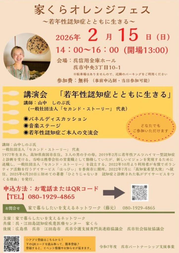 令和8年2月15日(日) 「家くらオレンジフェス」 が呉信用金庫ホール(呉市文化ホール)で開催されます。「若年性認知症とともに生きる」をテーマに一般社団法人「セカンド・ストーリー」代表 山中 しのぶ氏による講演があります。その後,ディスカッションを予定しており当協議会役員が登壇します。認知症に対する理解の促進,共生社会の取組みや課題など学ぶべきことが多くありますのでお知らせします。(参加無料) なお,事前申込みが必要です。https://forms.gle/ah3aiZYBRqEd3Uaq6 詳細はチラシをご確認ください。